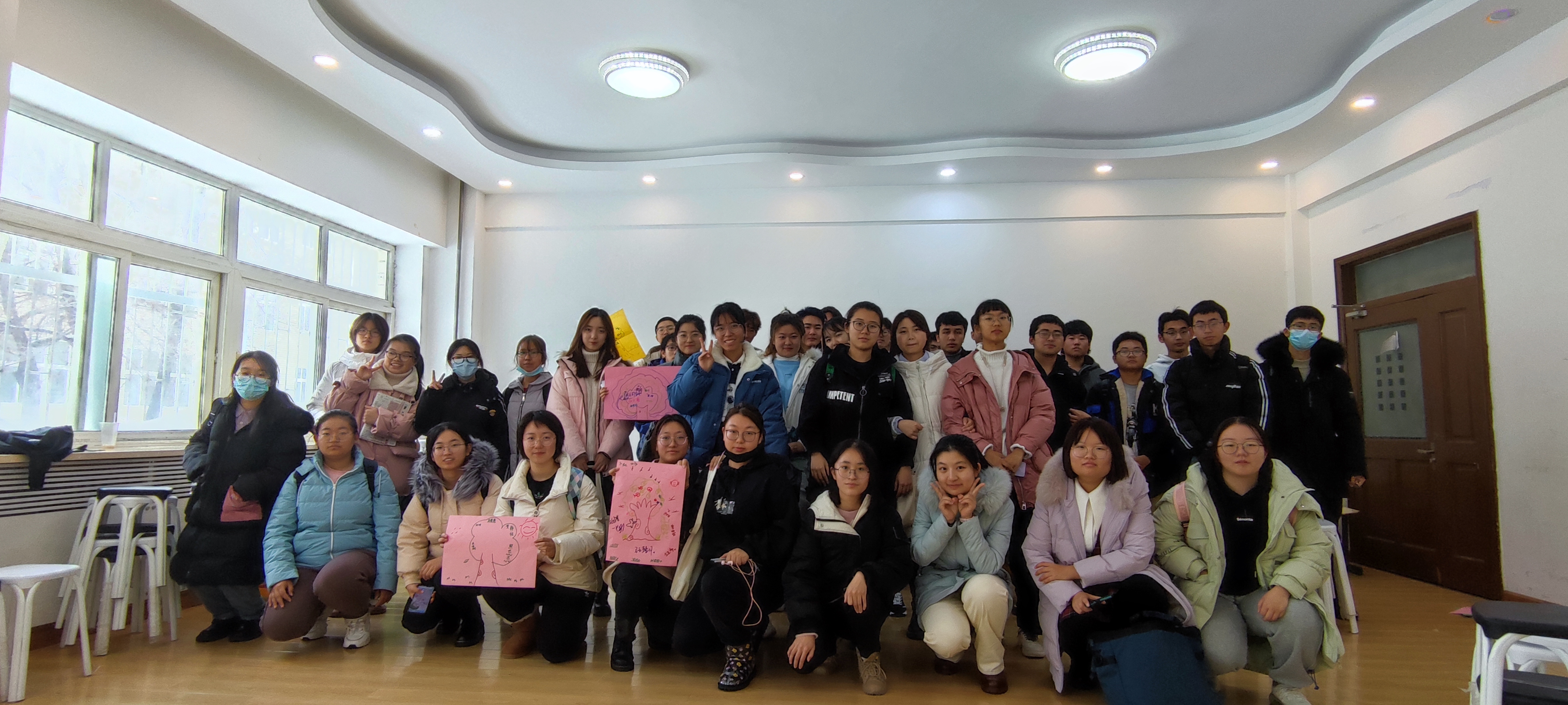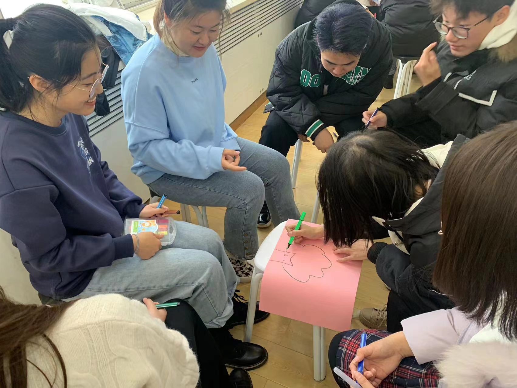 活动开始,主持人介绍本次团体心理辅导活动的主题和目标,并号召同学们敞开心扉,积极参与。同学们首先进行了“一分钟鼓掌”的热身活动,该活动旨在让同学们更好地认识自己,对自己有一个合理的预期。随后在“我知道”环节中,同学们以小组为单位,积极介绍自己爱好、家乡及特产等信息,同时也认真倾听其他同学分享的信息,气氛逐渐活跃起来。接下来,活动在同学们愈发高涨的情绪中来到了“信任之旅”环节。在此过程中,“引路人”同学利用肢体语言无声地引导“盲人同学”跨过一个个障碍,通过这个游戏同学之间建立了信任,也培养了一定的默契。紧接着在“人体字母”环节中,小组成员相互配合,利用身体动作摆出英文单词,同学们从一个个分散的个体凝聚为一个有力的整体。在最后的绘制“团体树”环节中,每个小组的同学共同绘制一张集体画,将对彼此的祝福和对未来的美好期许都融入其中。活动最后以拍一张集体照作为留念圆满结束。