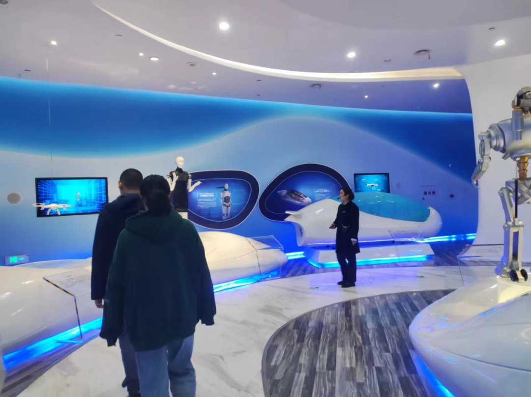 最后,在三楼的城市未来科技展馆。大家共同参观了长春未来交通、建筑、城市生态方面的建设规划,其中“快进2080”展览以极具科技感的设计表现了对未来科技的畅想和展望,吸引了同学们的兴趣。